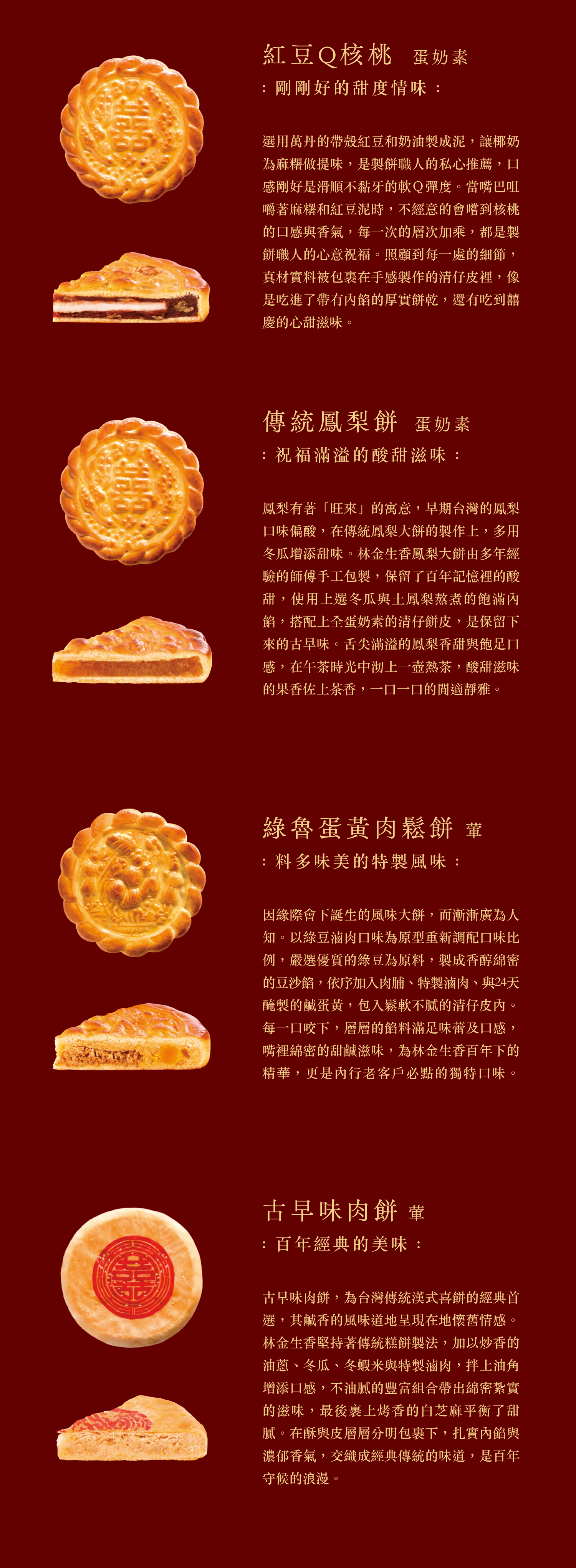 林金生香為製作結求心願的糕點,為喜慶祈福、婚慶和祭祀之始,囍餅是為傳遞喜訊給親朋好友,男方做聘時送給女方的餅,也稱嫁女餅、日頭餅。我們承續傳統手工製法,揉製圓滿之意的一斤大餅,並以文定儀式裝載聘禮的木盛為意象,裝載這份「起家餅」厚重的祝福和心意。
