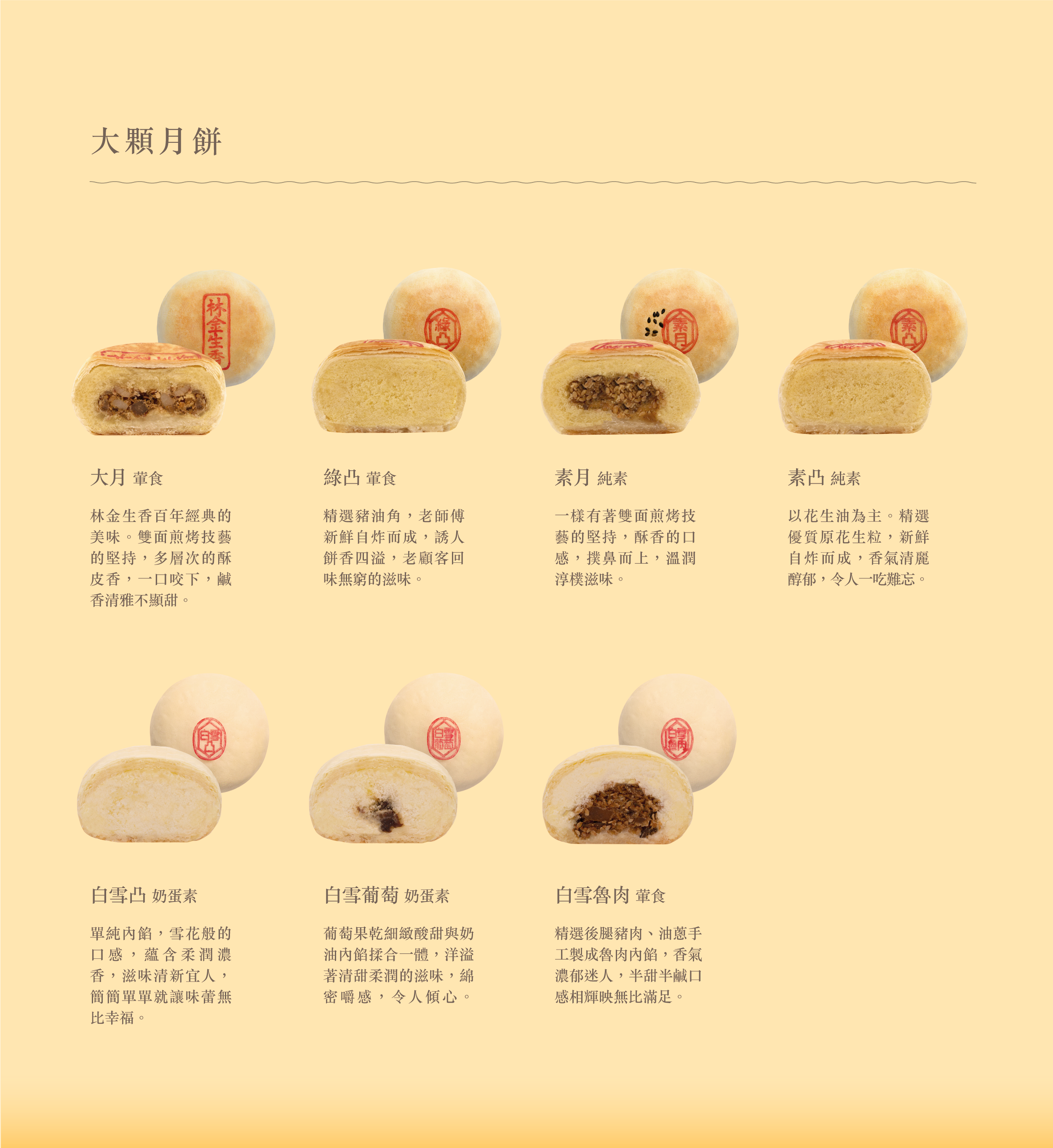 大月 (葷)、綠凸 (葷)、素月 (純素)、素凸 (純素)